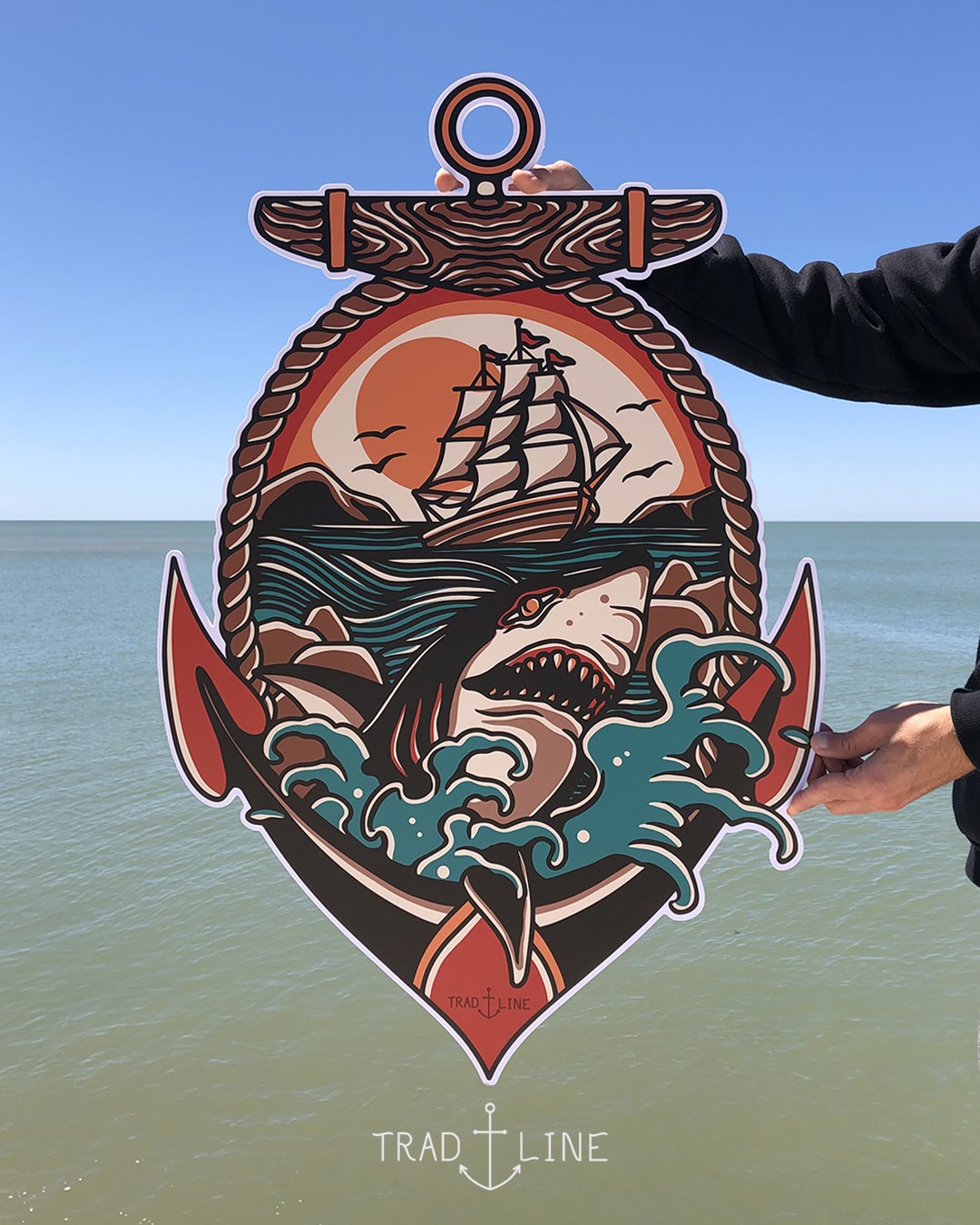 Quadro decorativo, inspirado em desenhos de tatuagens tradicionais - Âncora e Tubarão ao estilo Old School.