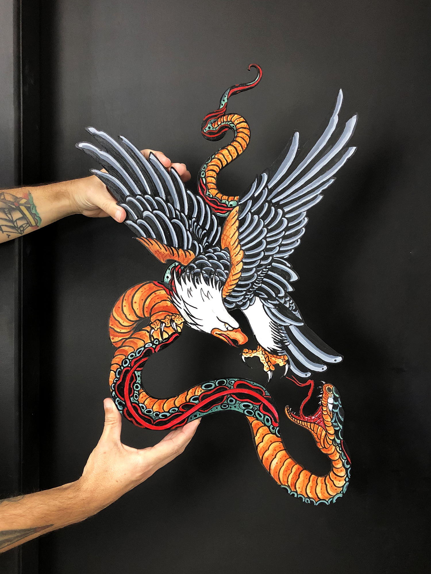 A cena retrata a batalha entre a águia e a serpente, executada manualmente pelo artista e tatuador Luciano (@lucstattoos), respeitando o tempo, o gesto e o processo da pintura artesanal.