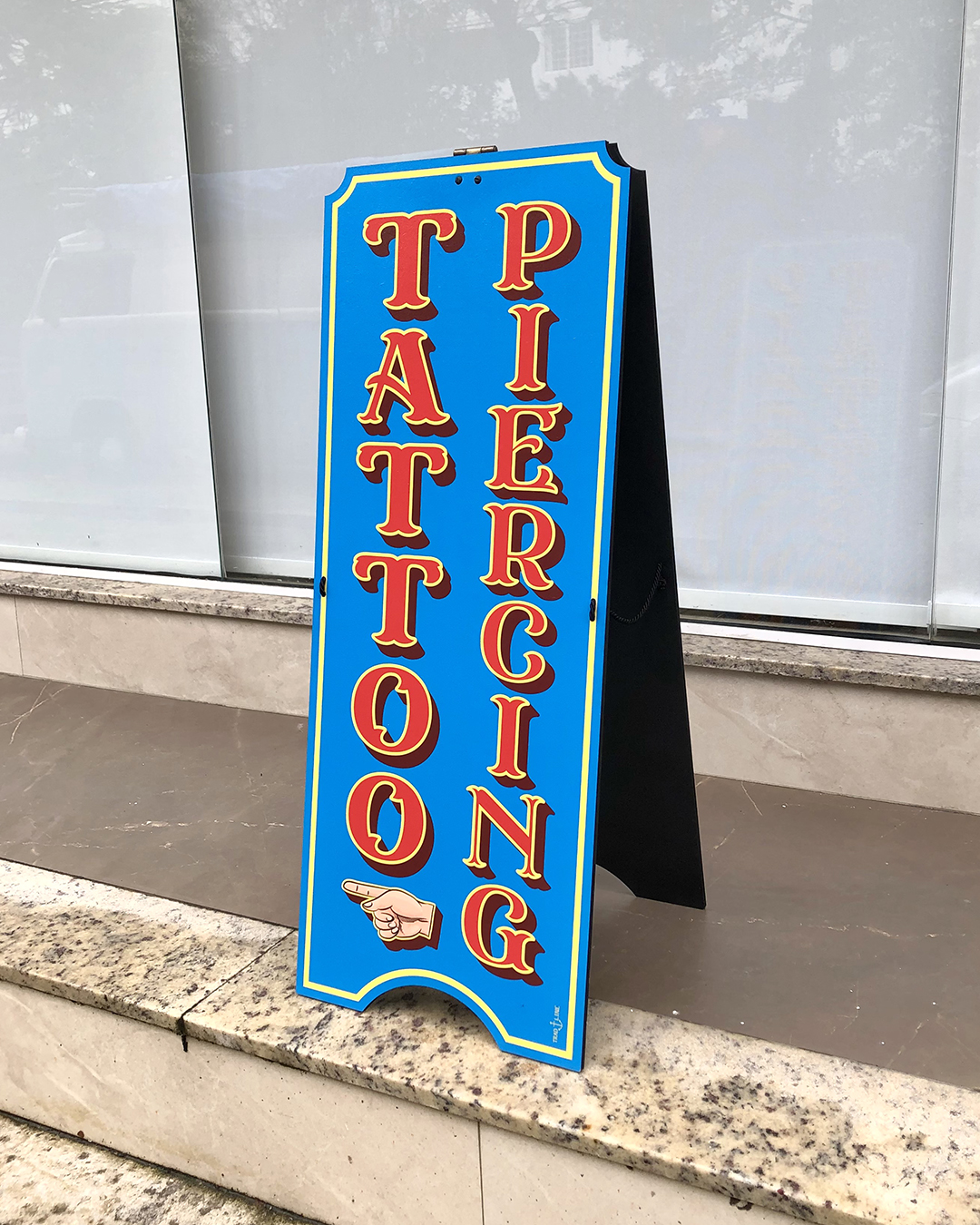 Cavalete decorativo/informativo inspirado em tipografias de estúdios clássicos de tatuagem.