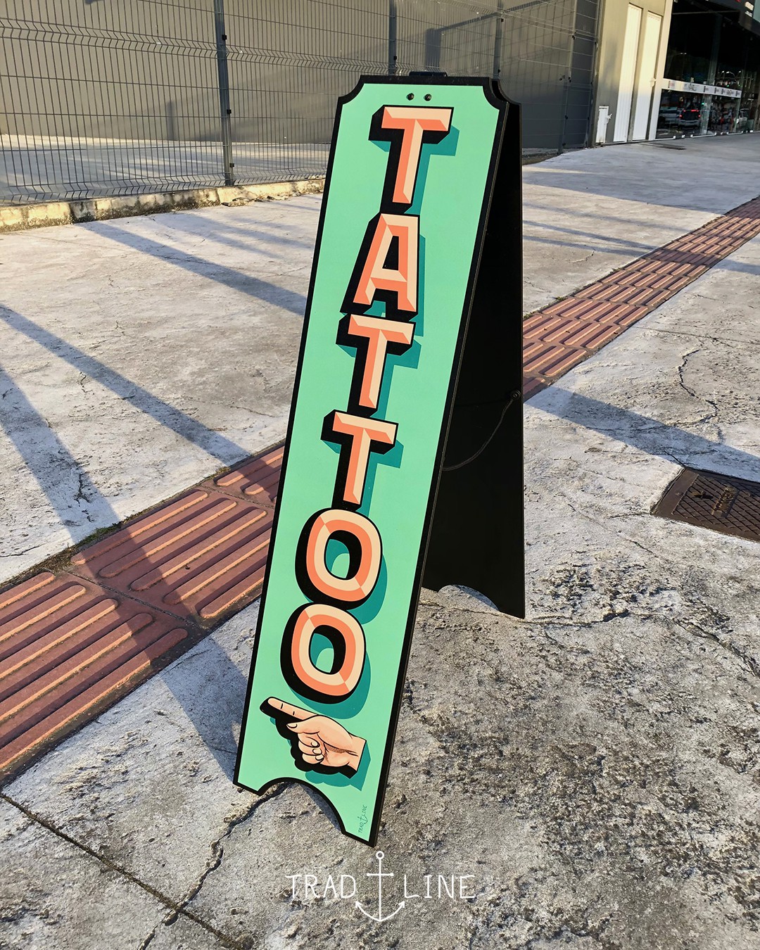 Cavalete decorativo/informativo inspirado em tipografias de estúdios clássicos de tatuagem.