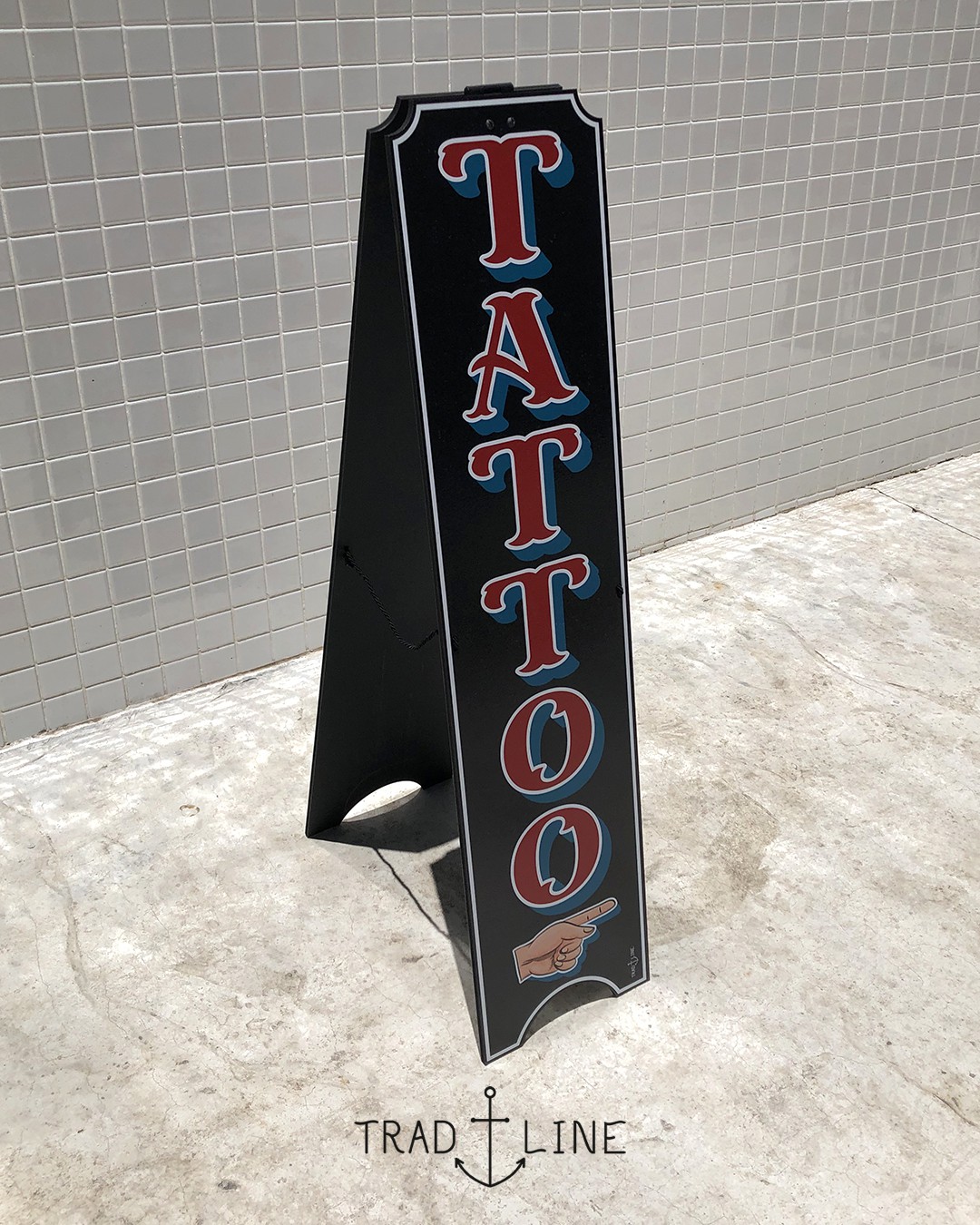 Cavalete decorativo/informativo inspirado em tipografias de estúdios clássicos de tatuagem.