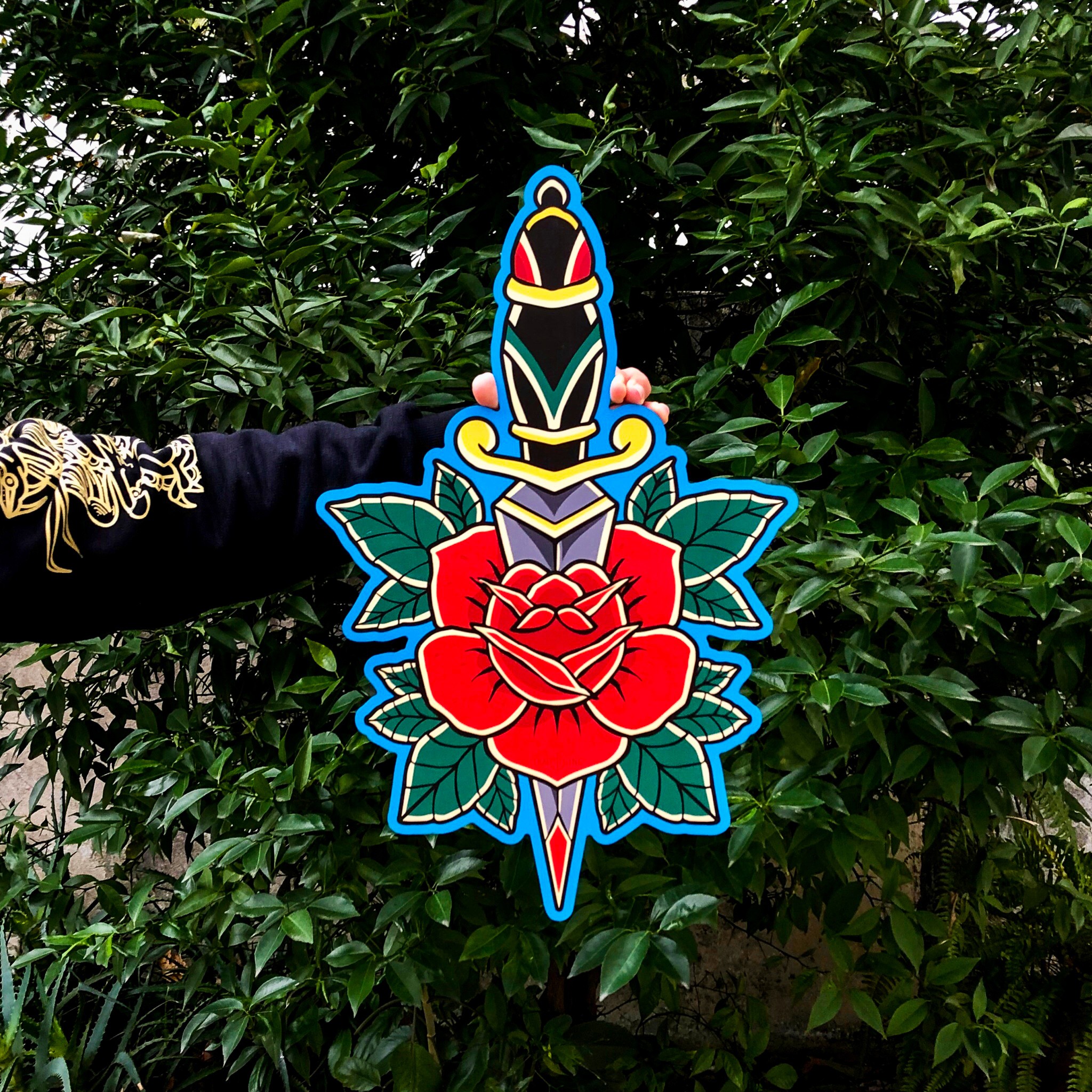 Quadro decorativo inspirado em desenhos de tatuagens tradicionais. Punhal e Rosa ao estilo Old School.