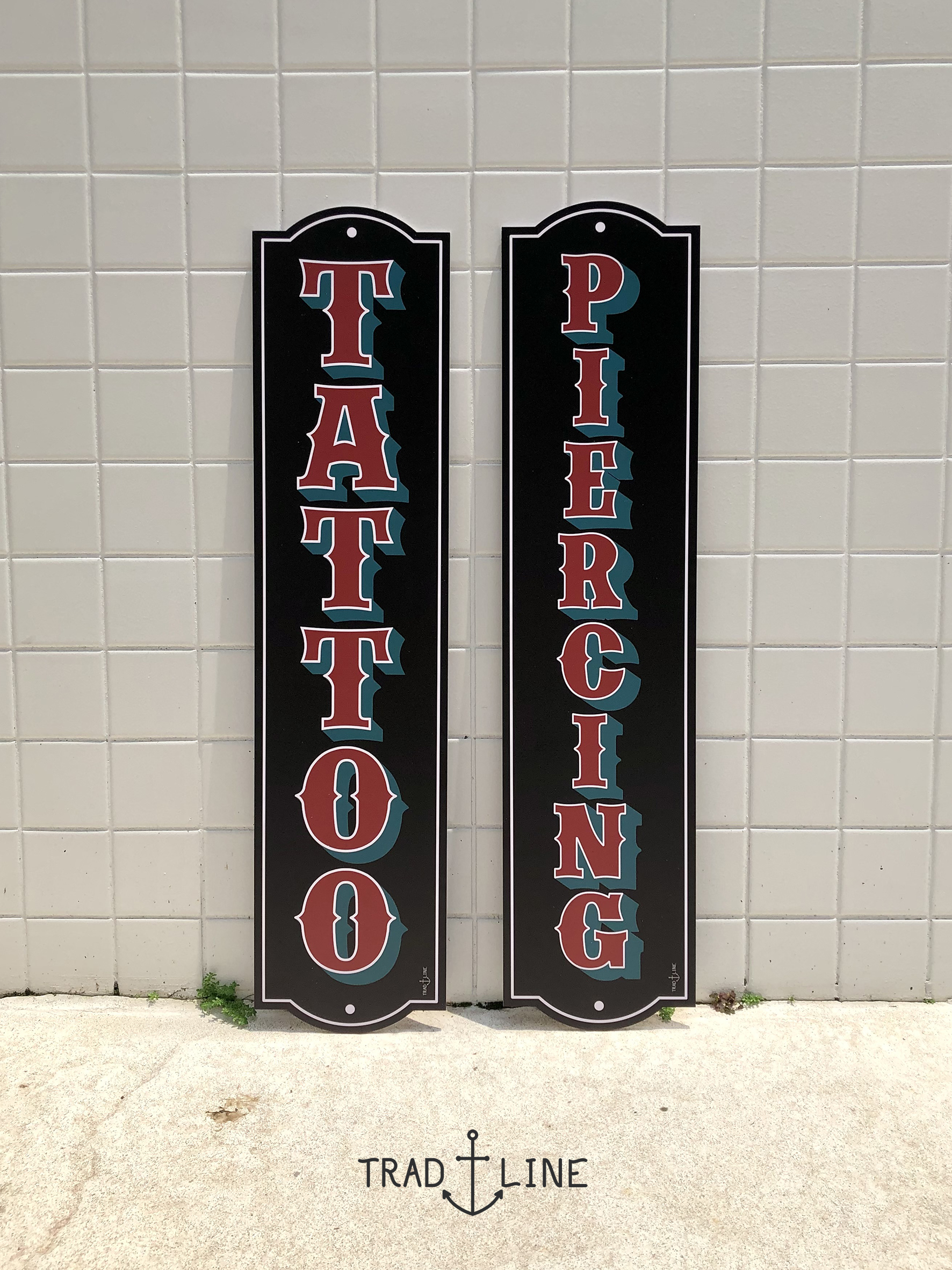 Par de placas decorativas inspiradas em tipografias de estúdios de tatuagem.