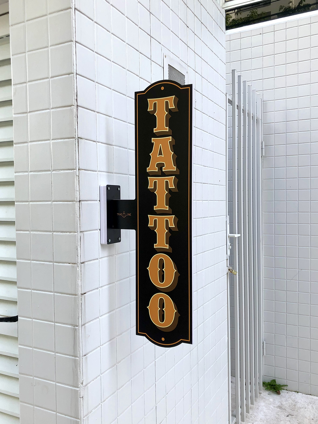 Placa decorativa inspirada em tipografias de estúdios de tatuagem.