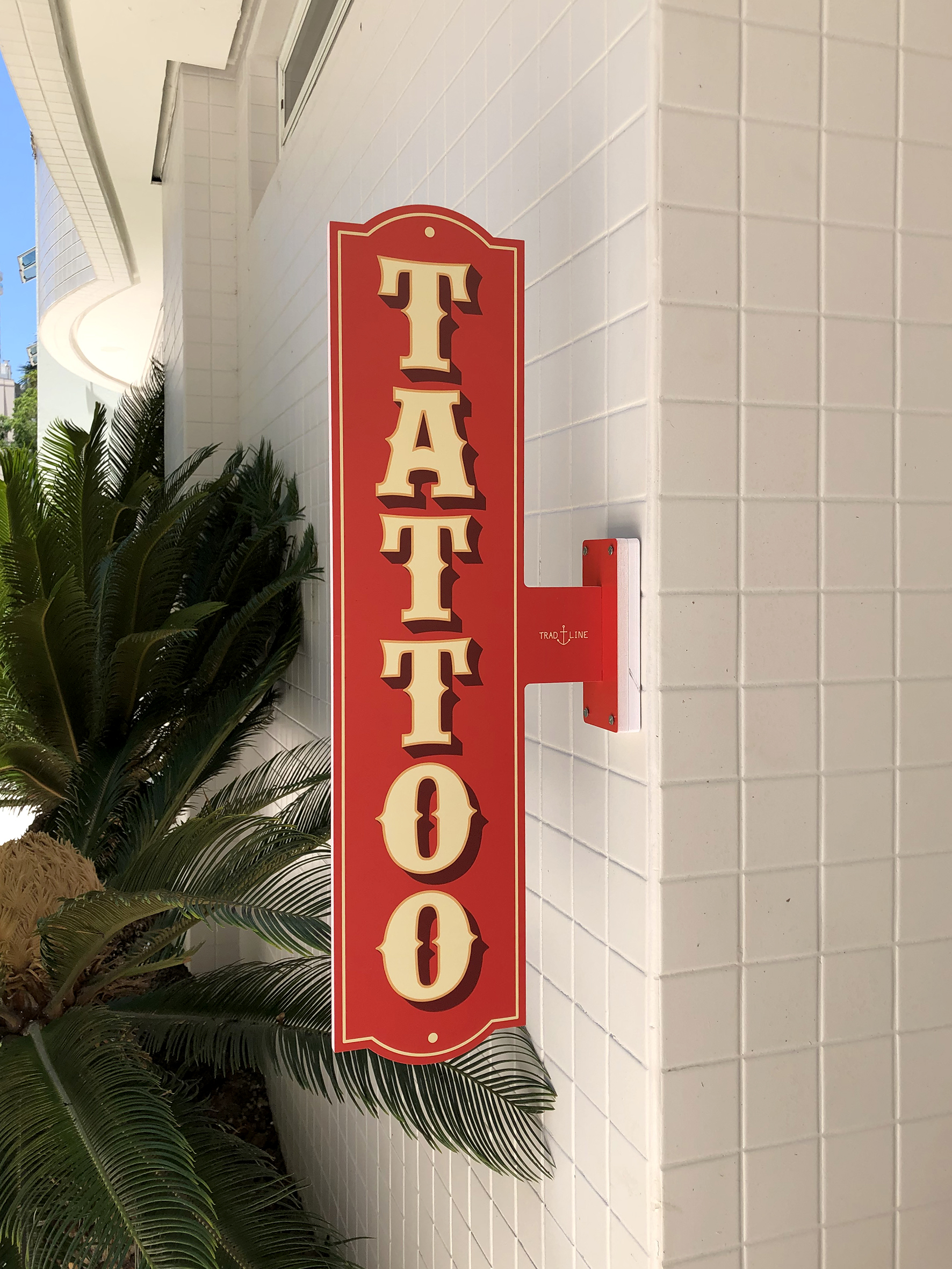 Placa decorativa inspirada em tipografias de estúdios de tatuagem.