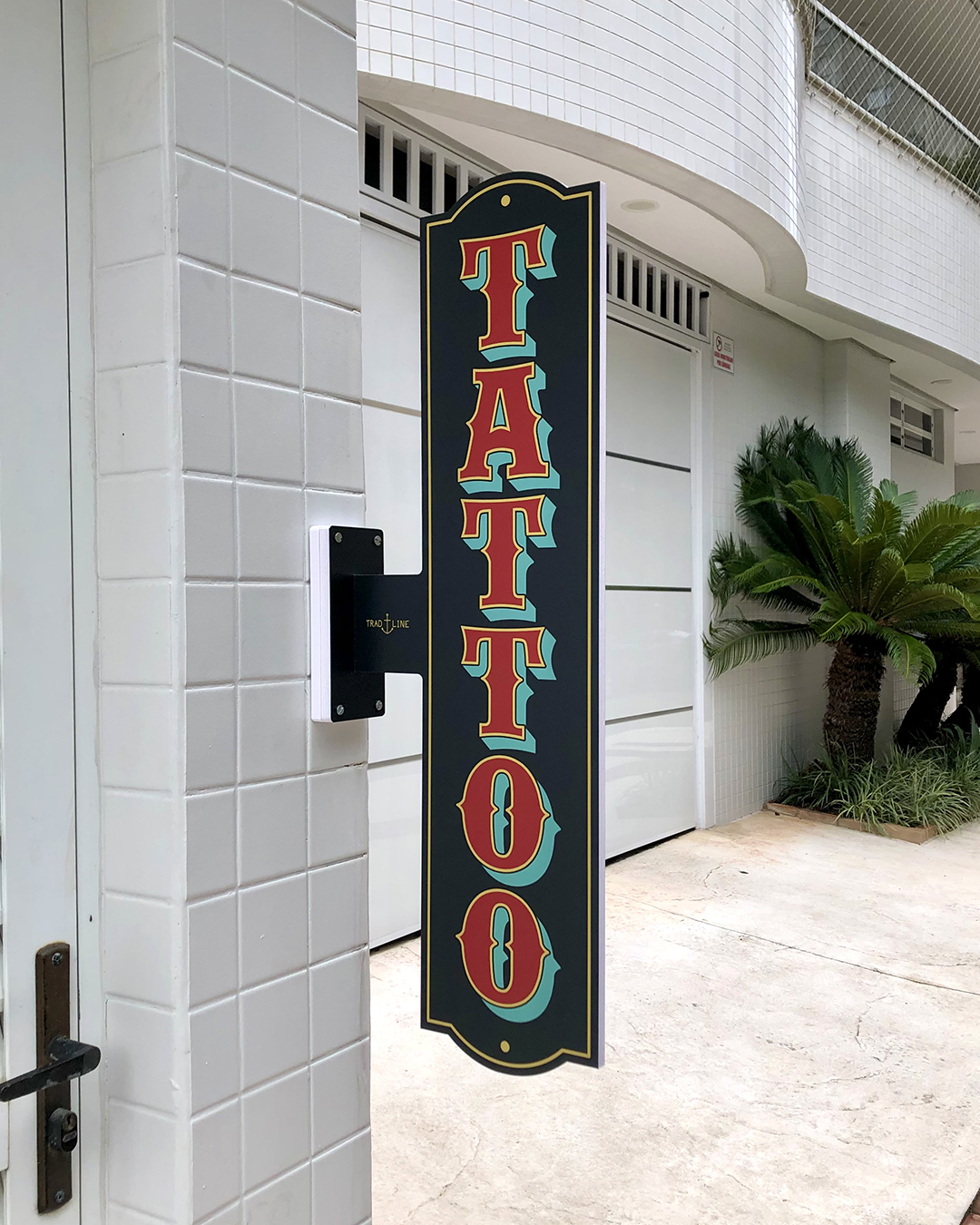 Placa decorativa inspirada em tipografias de estúdios de tatuagem.