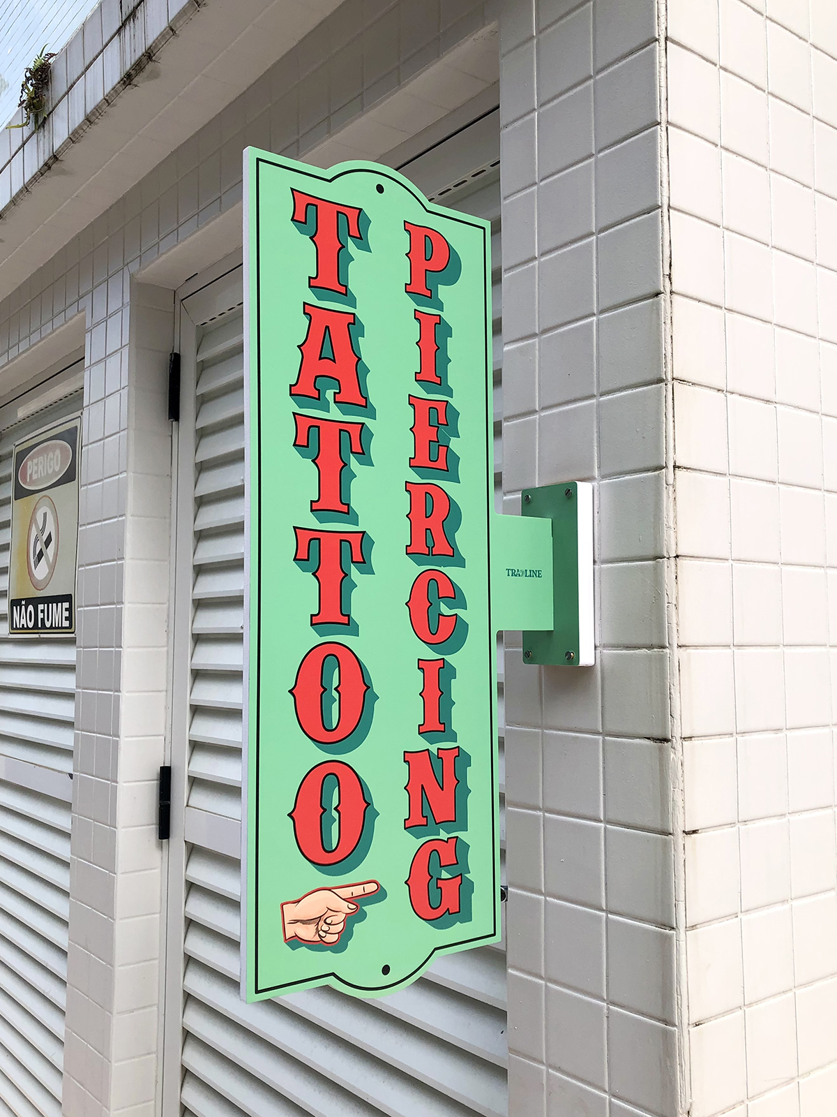 Placa decorativa inspirada em tipografias de estúdios de tatuagem.