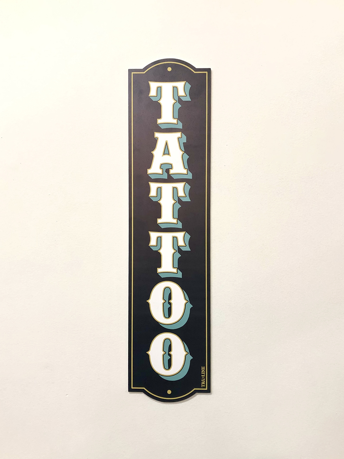 Placa decorativa inspirada em tipografias de estúdios de tatuagem.