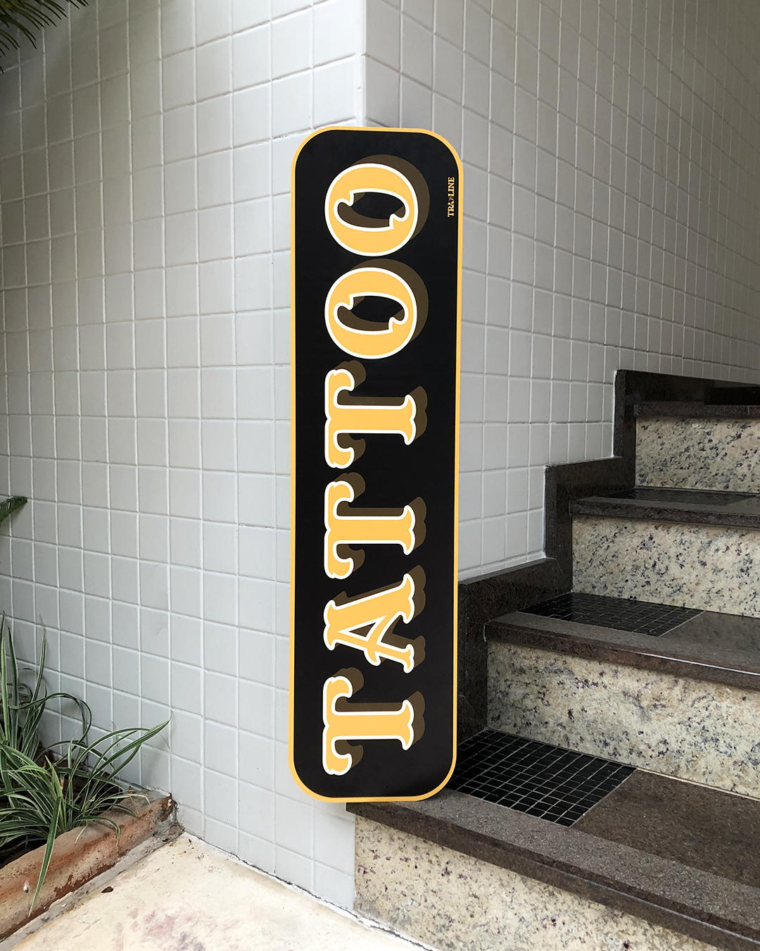 Placa decorativa inspirada em tipografias de estúdios de tatuagem.