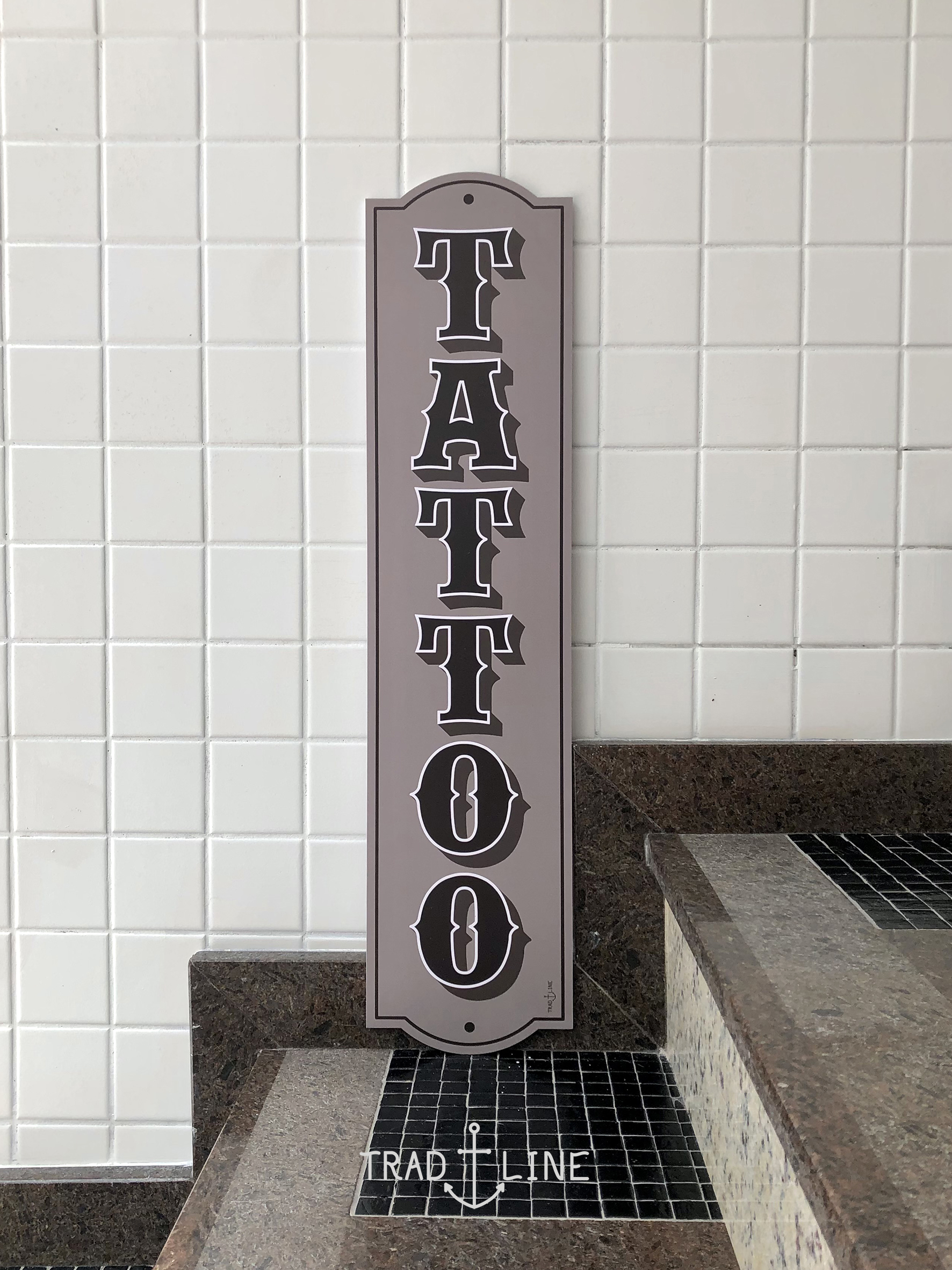Placa decorativa inspirada em tipografias de estúdios de tatuagem.