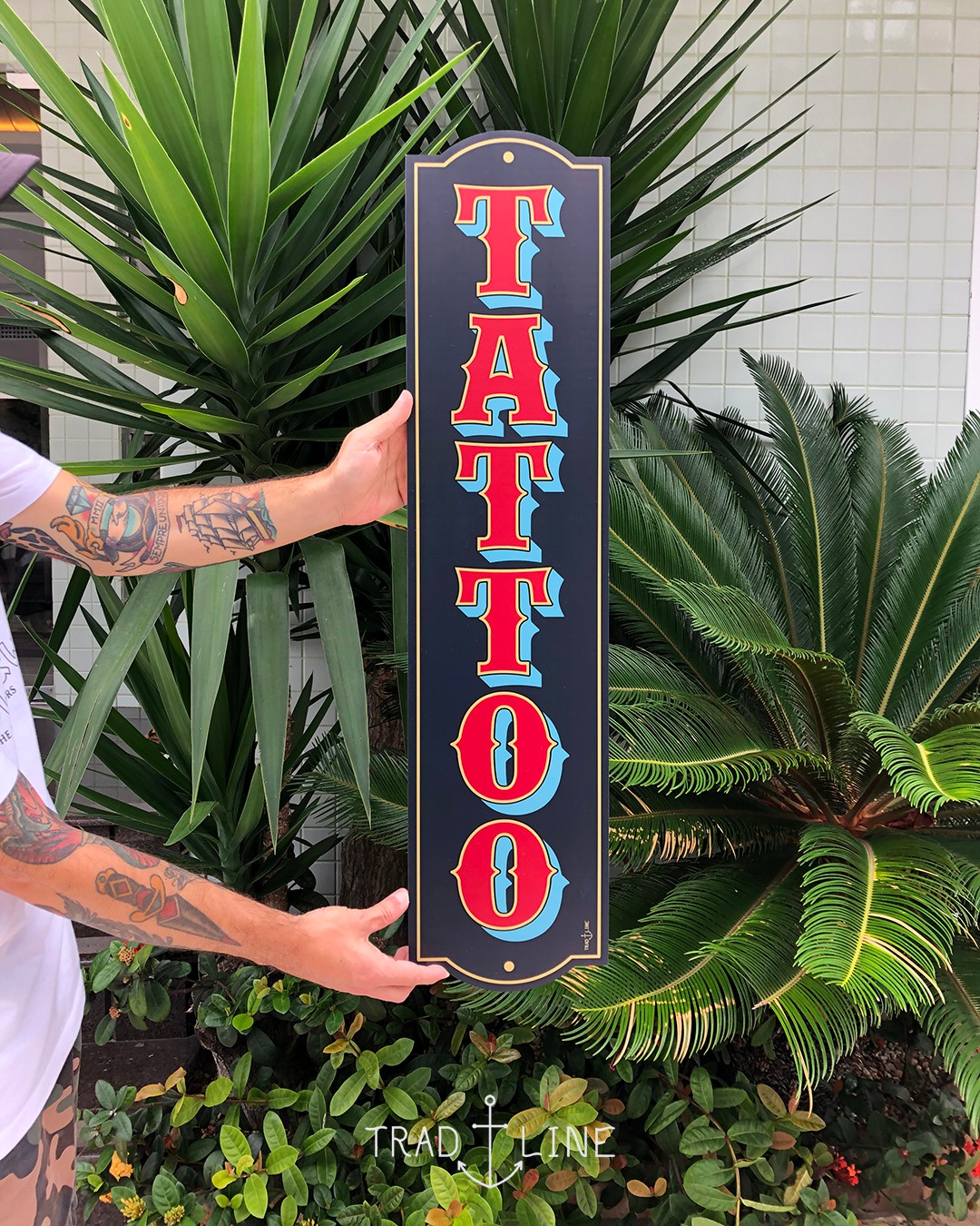 Placa decorativa inspirada em tipografias de estúdios de tatuagem.