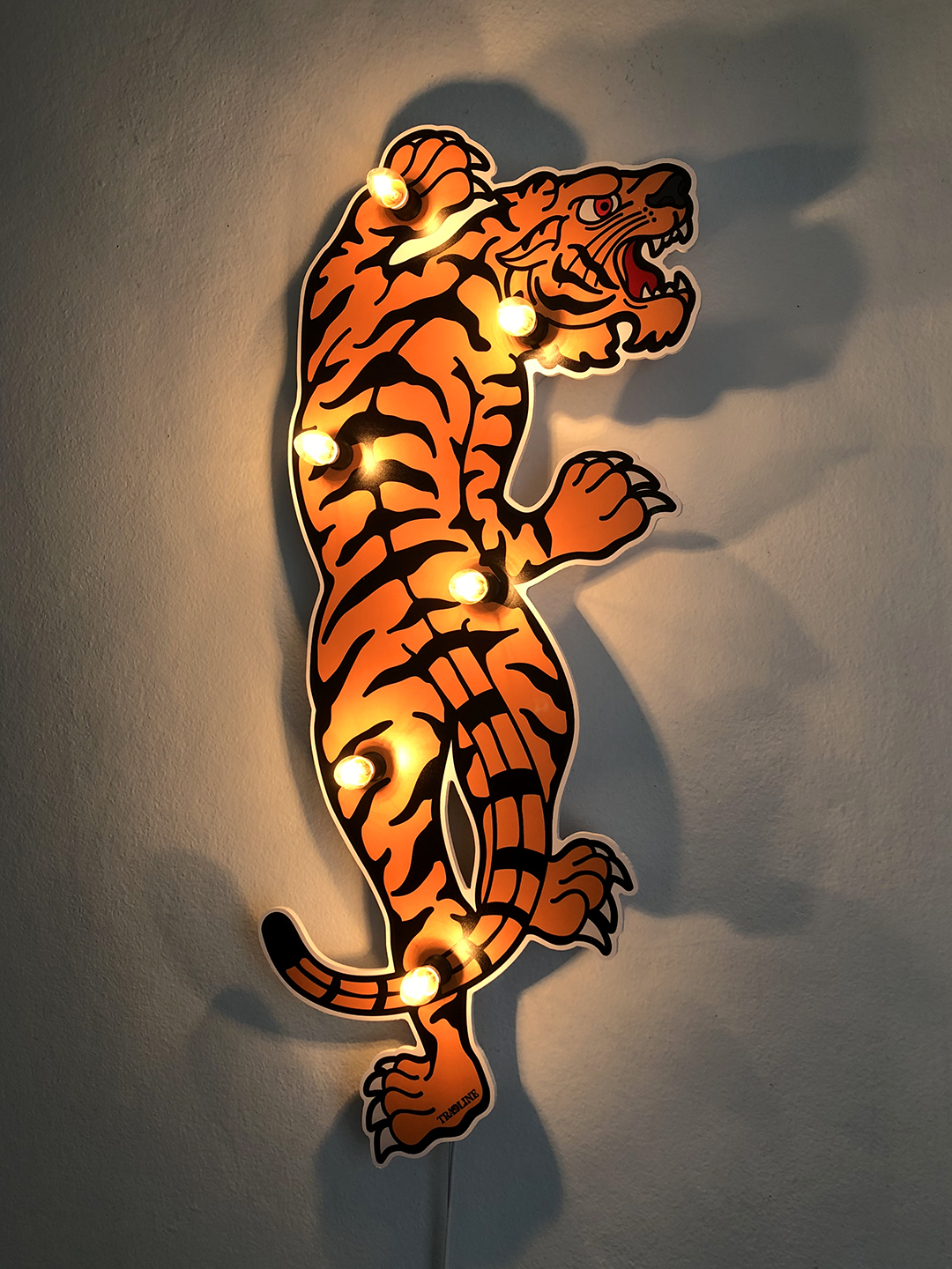 Peça decorativa com luzes, inspirada em desenhos de tatuagens tradicionais. Tigre escalando.